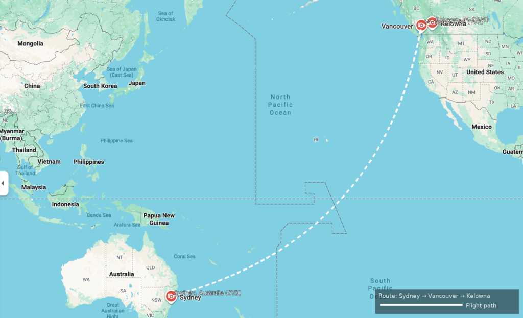 - Flights: SYD → YVR → YLW.